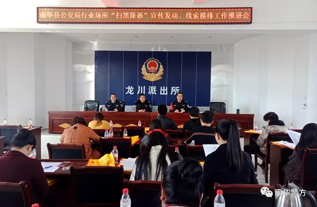 为进一步加强KTV、洗浴场所、网吧等娱乐场所治安管理,积极参与和支持扫黑除恶专项斗争,推进扫黑除恶专项斗争深入开展,1月22日,南华县公安局治安大队会同龙川派出所组织龙川镇辖区各娱乐场所业主、从业人员在龙川派出所五楼会议室召开了KTV、洗浴场所、网吧等娱乐场所扫黑除恶宣传发动、线索摸排工作推进会。会上,治安大队教导员周祖名、龙川派出所行业场所专管民警分别传达学习了党中央国务院及各级党委政府关于扫黑除恶专项斗争的有关精神,解读了中央部署开展扫黑除恶专项斗争的背景、重大意义、打击重点和相关案例,强调了扫黑除恶专项斗争的政治性、紧迫性、严肃性。会议要求:各娱乐场所要深刻理解扫黑除恶专项斗争的重大意义,进一步强化扫黑除恶专项斗争的宣传;加强行业自律,杜绝场所内出现黄、赌、毒等违法行为,确保场所人员不参与,不从事与黑恶势力相关的违法犯罪活动;各娱乐场所要合法守法经营,加强内部安全管理,守好自己的“责任田”,积极举报涉黑涉恶案件线索,与不法行为作斗争;加强对从业人员的教育管理,强化安全防范,坚决抵制与涉黑涉恶组织、人员进行勾结,避免滋生涉黑涉恶违法犯罪,严防涉黑涉恶违法犯罪发生。
