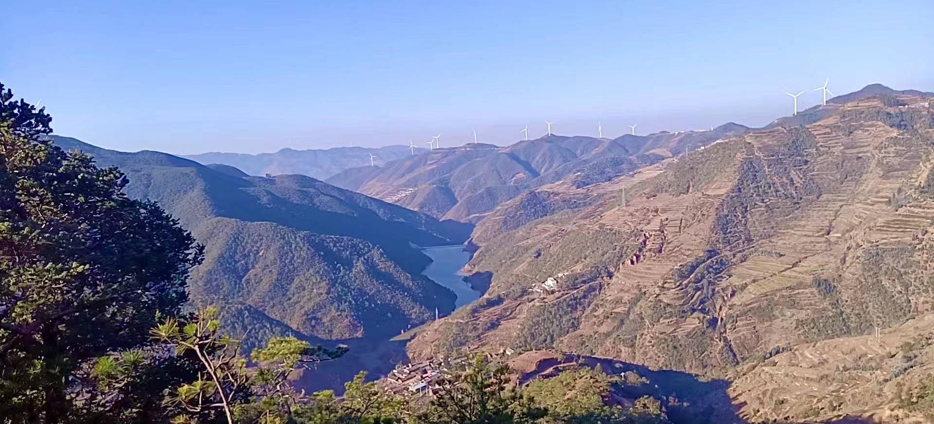 能量十足的风力发电机仿佛孩童手中的风车,绵绵无尽的高山若隐若现,延绵着消散在天边。蒿子箐忽现眼前,奔腾不息,豁达壮美。