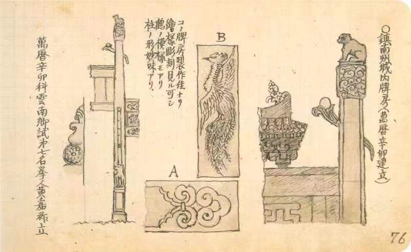 在其《手绘天朝》一书的第三卷“云南府”一章中的76图中,伊东绘制了彩色的亚魁坊图,其梁、柱、脊、座、狮、鼓、盆,檐等构件俱在图中。在其图右侧标注为:镇南州城内牌房(万历辛卯建立);其以日语作了标注,中文意思大致为:牌房制作精良,绘样雕刻可见鹤、狮模样,形态品质俱佳;左侧文字标注:万历辛卯科云南乡试第七民举人黄嘉祚立。值得一提的是,在伊东绘制的图中,除绘制了张家培先生记述的梁、柱、脊、座、狮、鼓、盆等构件外,还绘制了“鹤“形图案、坊“檐”等构件,可以说这是了解牌坊真容的第一手资料,后世之人观其绘图,几可照此重建,而能一丝不苟,完全复原,在没有绘图软件的年代,这无疑是珍贵的历史资料,可为镇南文史之补充。虽然,时人皆言,伊东此行之目的,实为窥伺中国机密,以为其再次侵略中国作全准备,然而,世以时迁,对于保存历史遗迹来说,伊东却是功不可没。