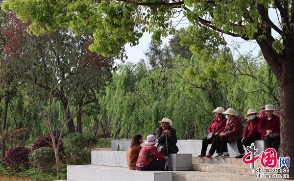 (在生态步道上休闲聊天的老人,拍摄于4月7日)