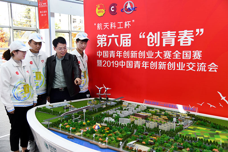 2019年11月1日,在山东青岛举行的第六届“创青春”中国青年创新创业大赛全国赛暨2019中国青年创新创业交流会上,参会人员在给志愿者介绍新乡村智慧能源服务模式。新华社记者 李紫恒 摄