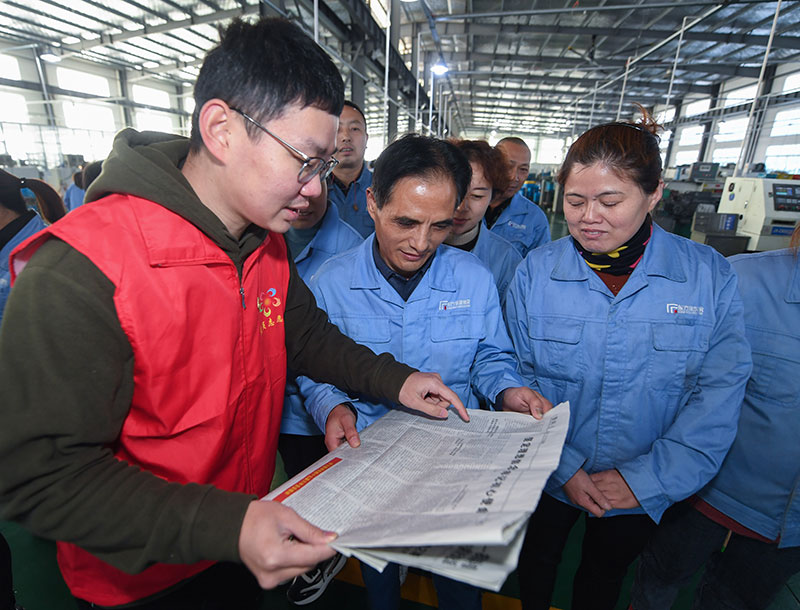 2021年11月24日,在浙江省杭州市临安区一家公司车间,青年党员志愿者在宣讲党的十九届六中全会精神。新华社记者 徐昱 摄
