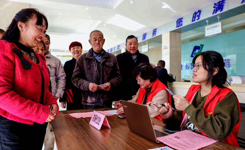 河北省邢台市襄都区宴家屯镇综合服务中心工作人员协助办事群众填写相关表格(2022年3月30日摄)。