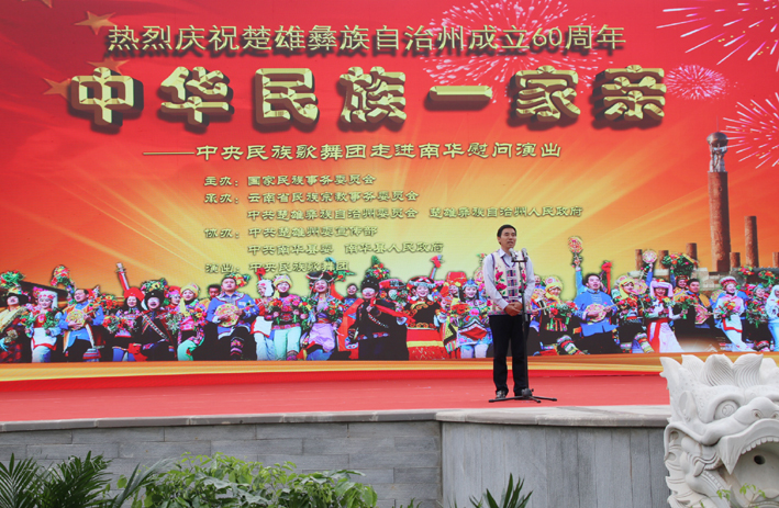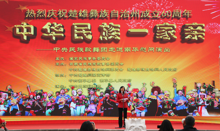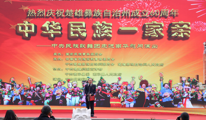 4月12日,由国家民委主办,云南省民宗委和州委、州人民政府承办的“中华民族一家亲”庆祝楚雄彝族自治州成立60周年中央民族歌舞团走进南华慰问演在县城龙泉广场举行。