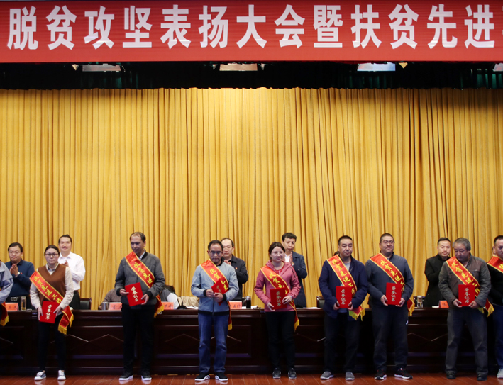 杨梦婷宣读表扬决定;与会领导为受表扬的脱贫攻坚先进集体和个人颁奖;部分受表扬的光荣脱贫户、扶贫明星企业负责人在会上作先进事迹报告。