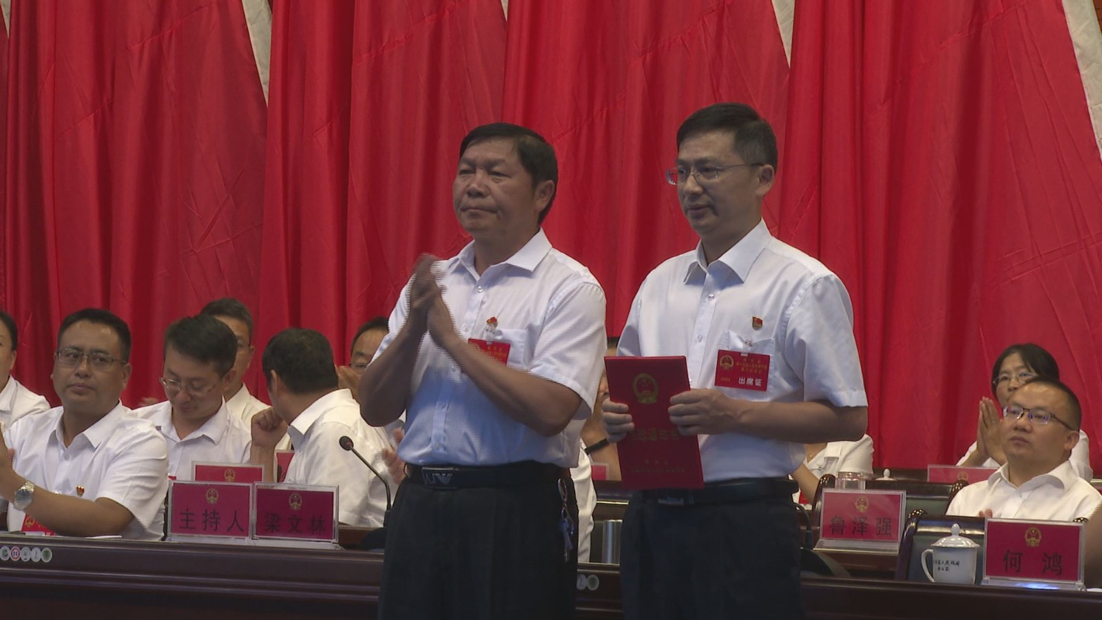 县委书记梁文林为新当选的县十七届人大常委会副主任、县十七届人民代表大会财政经济委员会主任委员颁发当选证书,县人大常委会主任肖志为新当选的县十七届人民政府县长颁发当选证书。