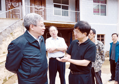 欧青平与村党支部书记交谈,并叮嘱随行的基层干部,要持续抓好贫困动态管理工作,并因地制宜调整完善规划,从实际出发,按照“两不愁三保障”标准,做到“应纳尽纳”、“应退尽退”、“应扶尽扶”。
