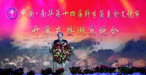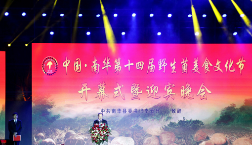 县委书记李云升在开幕式上致辞,他指出,绿色是南华的底色,生态是南华的优势,南华山水灵秀、人杰地灵、风情浓郁,具有悠久的历史文化和民族文化,享有“九府通衢地”、世界“野生菌王国”、“中国野生菌之乡”、“中国野生菌美食县”、“中国核桃之乡”等美誉,是国家“一带一路”通往南亚、东南亚的咽喉要塞,是长江经济带、孟中印缅经济走廊的重要通道。近年来,南华县借力发力,始终坚持绿色发展,厚植发展优势,深入实施“产业富民、工业强县”战略,把野生菌产业作为产业转型升级的重要载体,展示生态文明建设的重要窗口,推动群众脱贫致富的重要抓手,取得了明显成效,2016年,全县野生食用菌集散交易量达7670多吨,交易额5亿多元。