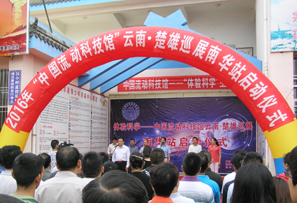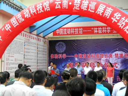 7月18日上午,“体验科学”中国流动科技馆云南楚雄巡展南华站启动仪式,在南华县青少年活动中心举行,标志着“中国流动科技馆”巡展活动在我县正式拉开帷幕,展出时间为7月18日至9月18日,每周一至周五上午8∶30—11∶30,下午14∶30—17∶30免费向公众开放,为期两个月。