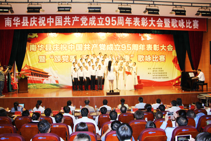 南华县庆祝中国共产党建党95周年表彰大会暨“颂党恩、促脱贫、奔小康”歌咏比赛在公务中心礼堂举行。 全县县处级领导、受表彰的先进基层党组织负责人、优秀共产党员、优秀党务工作者代表和县级部门党组织负责人,以及参加歌咏比赛的党员干部700余人参加了活动。会议表彰了一批在全县改革、发展、稳定工作中涌现出的先进基层党组织和优秀党务工作者、优秀共产党员,与会领导为受表彰的先进集体和个人代表颁奖。同时,来自全县各党组织的20支代表队进行了歌咏比赛,各个参赛队的队员们饱含激情,倾心投入,用歌声表达着对党的敬爱之情,唱出了对党、对祖国的美好祝愿,抒发着庆祝中国共产党95周年华诞的喜悦情怀。