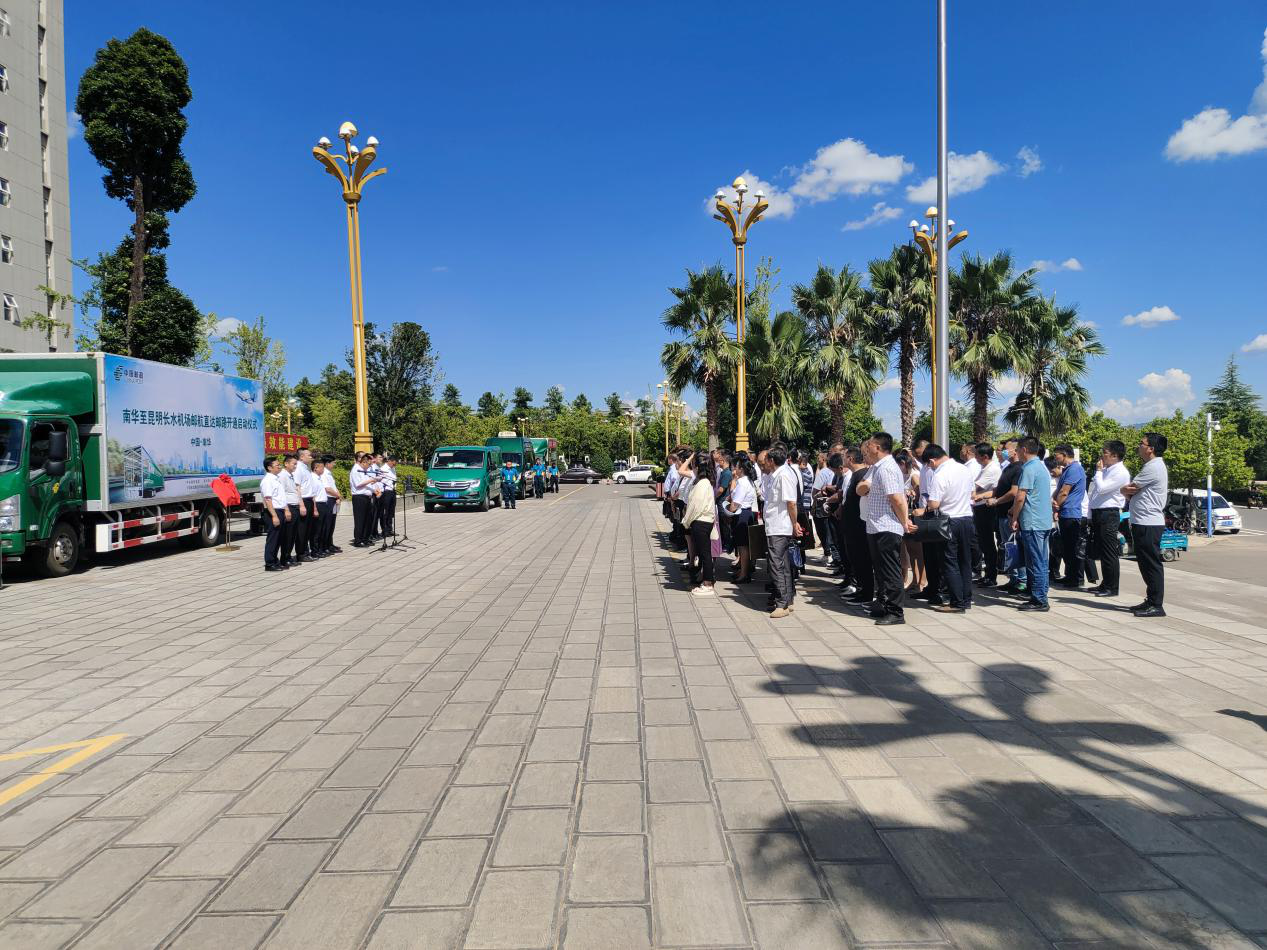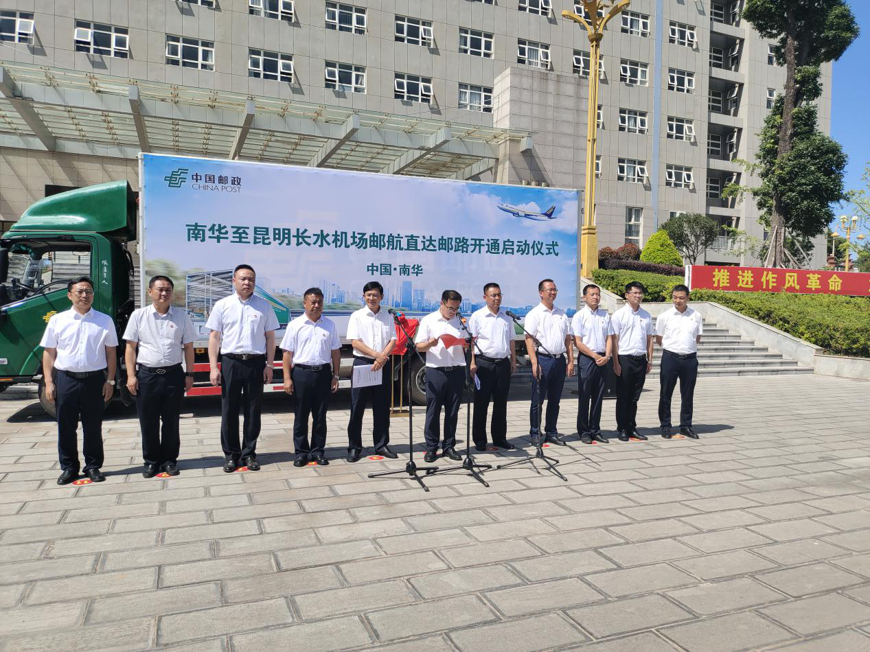 邮路开通仪式现场,县委书记马特、中国邮政集团楚雄分公司党委书记、总经理杨领周共同为邮路开通仪式揭牌,最后县委书记马特宣布南华至昆明长水机场邮航直达邮路正式开通,等候在现场的邮路车辆满载南华生鲜农特产品发车驶向昆明长水机场。