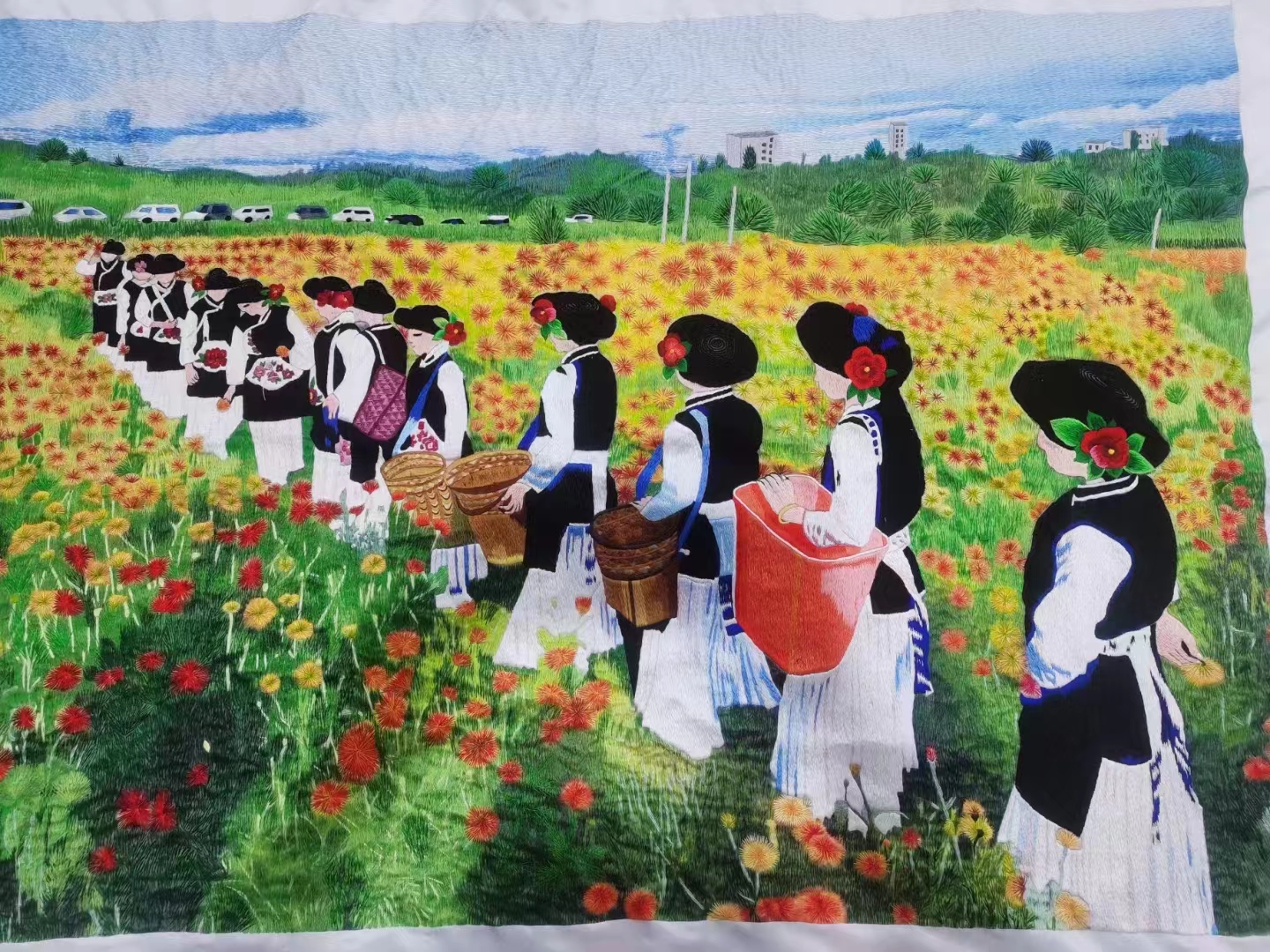 夏季,走进南华大山深处,万物生机勃勃,树木繁茂,花草艳丽。南华县的绣娘们,用心观察花草的千姿百态,以高超的技艺,将夏花的绚烂留在了黑、蓝的布上,缝进头巾、衣襟、坎肩、围腰、腰带等各式各样的服饰中,传达出对生活的热爱和对大自然的歌颂。