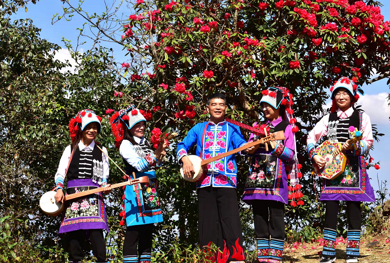 马缨花在彝语中叫“咪依噜”,是彝家人眼里的幸福之花、吉祥之花,也是南华大山里春天开得最多的花。南华彝族民间艺人把它绣在衣服的显眼部位,尤其是头饰、头帕及帽子飘带上,全都绣满了马缨花,象征日子越过越红火。