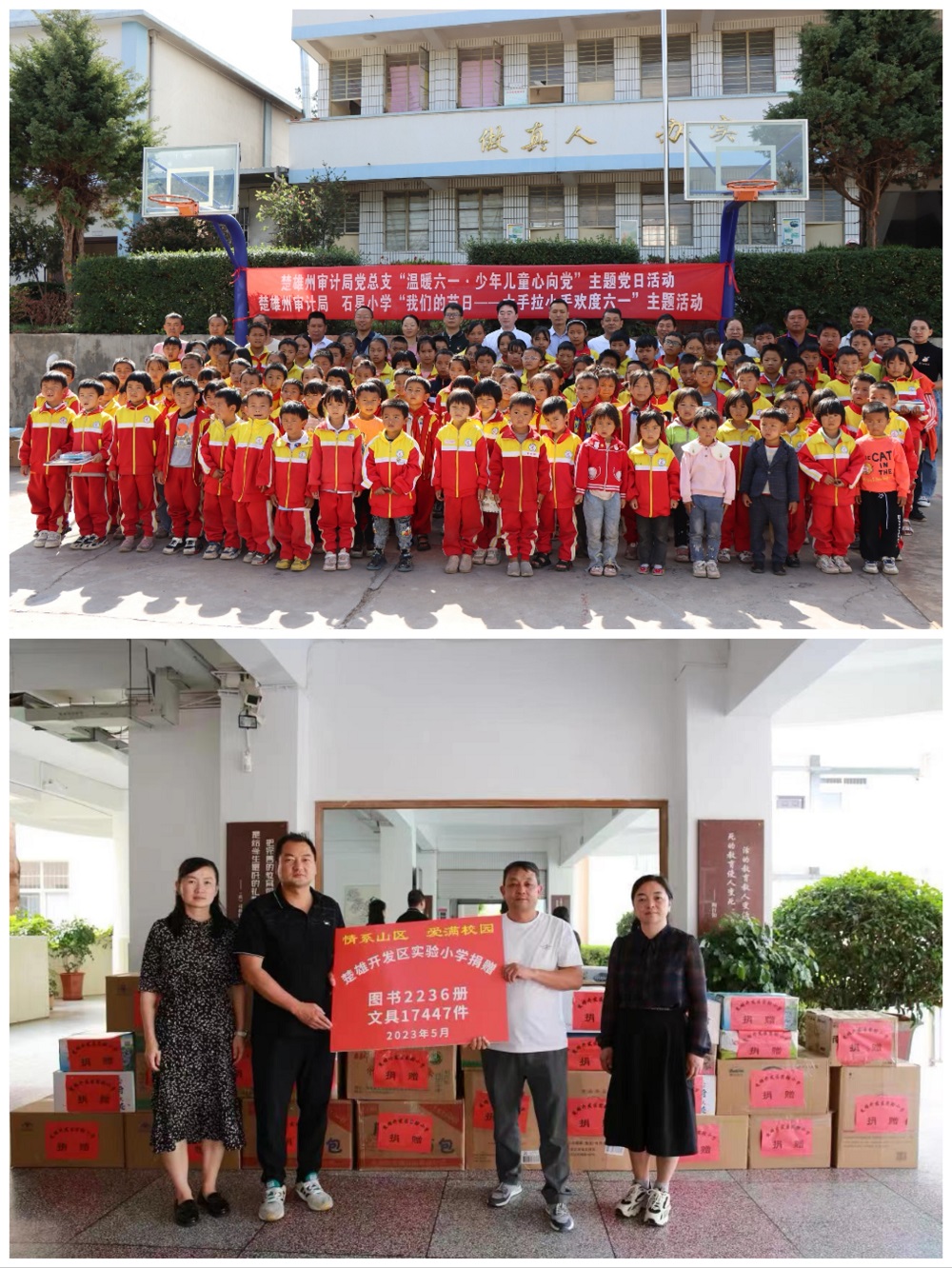 “六一”国际儿童节期间,州审计局党总支向沙桥镇石星小学114名少年儿童捐赠价值6840元的学习用品和书籍;州财政局党总支向山场小学93名在校学生捐赠价值5500余元的学习用品;州开发区实验小学向沙桥中心完小和天申堂完小捐赠图书2236册,文具17447件。