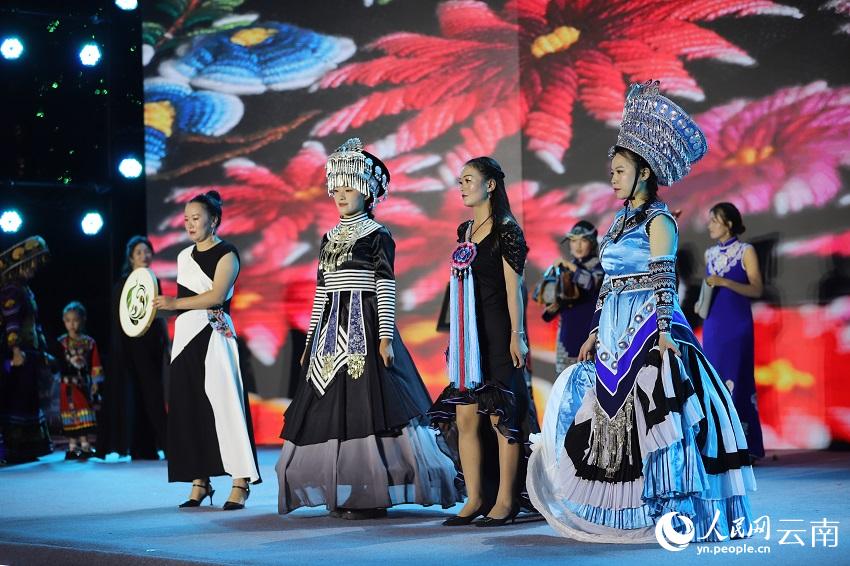 模特在展示彝族服饰及彝绣文创产品。人民网记者 李发兴摄