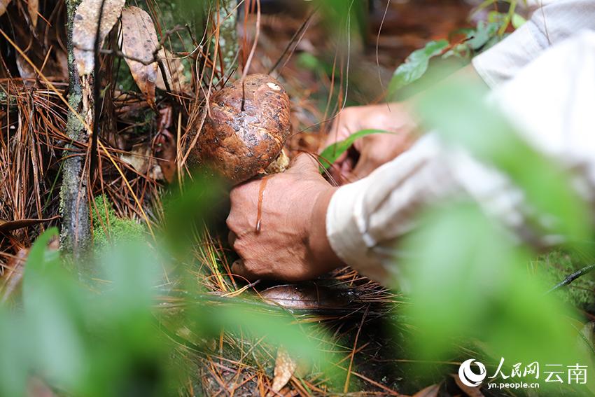 毕摩在采摘首朵松茸。人民网记者 李发兴摄