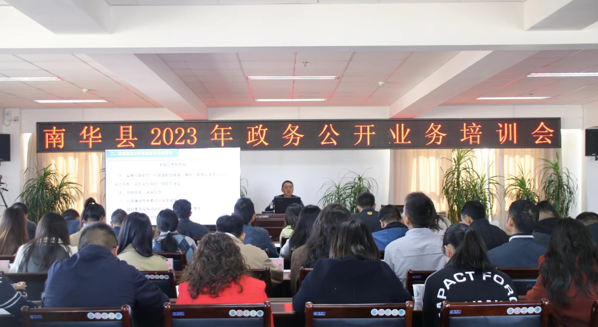 2023年11月10日上午,南华县2023年政务公开业务培训在县公务中心举办,县政府办公室副主任罗华张、县政府办公室网管中心主任何乾周分别开展《中华人民共和国政府信息公开条例》解读、12345政务服务便民热线业务培训及政务公开工作业务培训。