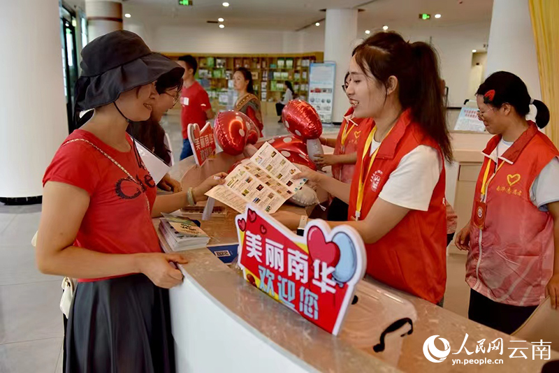 志愿者正在给游客介绍南华县内游览点。者美春摄