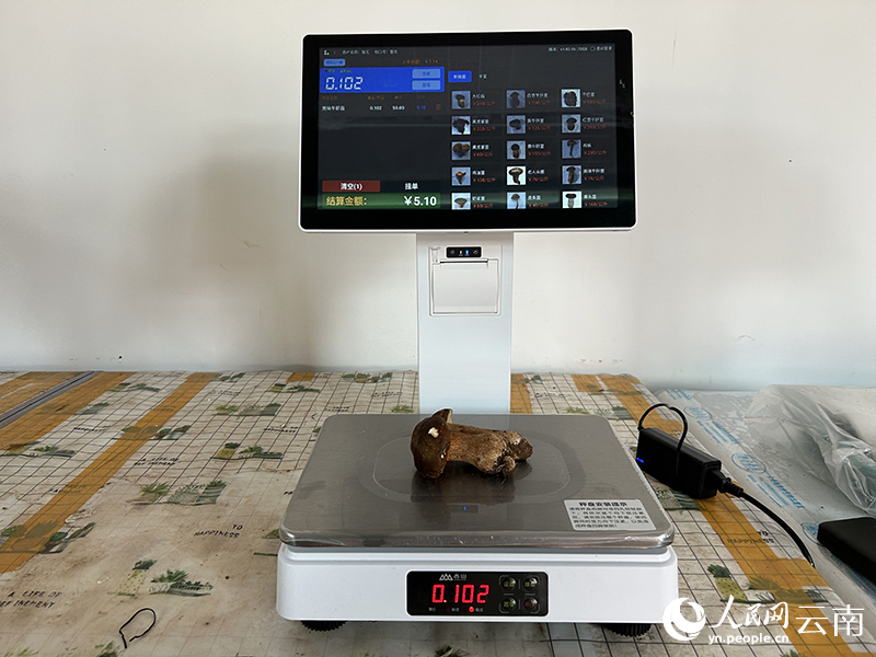 将菌子放在AI智能称上,屏幕就会显示出菌子的名称。人民网记者 刘怡摄