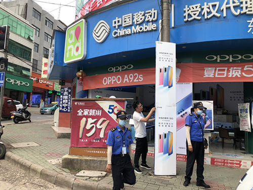 OPPO手机店在城市公共设施上悬挂广告牌,责令整改