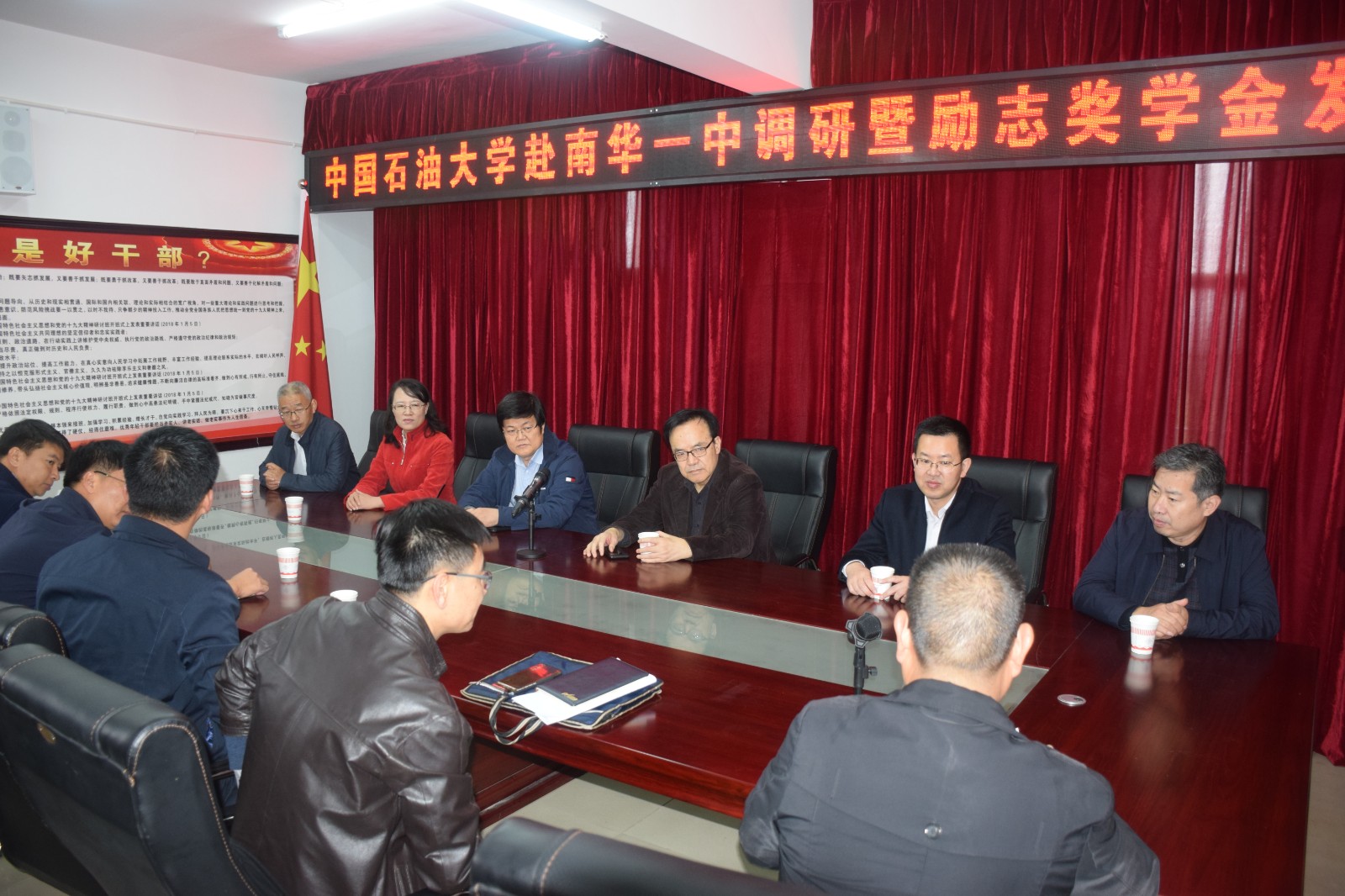 10月30日,中国石油大学(北京)校长张来斌带领校长助理、人事处处长等调研组一行7人,在州委、州人民政府、州扶贫办领导和县领导的陪同下,深入南华民族中学、南华一中开展调研活动。