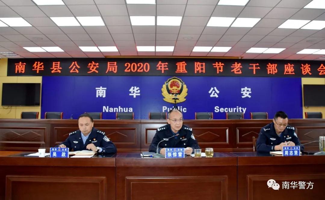 日前,南华县公安局举行2020年“重阳节座谈会,县人民政府副县长、县公安局党委书记、局长张惊雷,县公安局党委委员、副局长周志贤与47名退休干部欢聚一堂,共度重阳佳节。