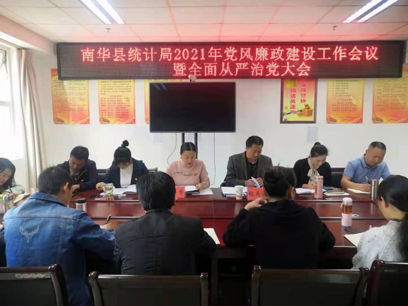 3月29日,南华县统计局召开2021年党风廉政建设工作会议暨全面从严治党大会,会议邀请县纪委县监委派驻县财政所纪检组组长张庆业同志到会指导,并讲授廉政党课和开展集体廉政提醒谈话,全局干部职工共18人参加会议。