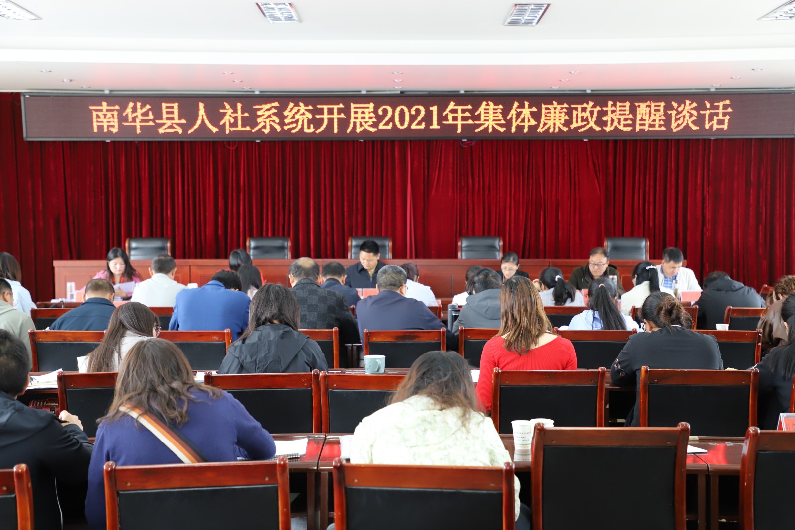 为进一步落实全面从严治党主体责任,积极推进全县人社系统党风廉政建设工作,3月26日上午,县人社局对全县人社系统干部开展集体廉政提醒谈话。