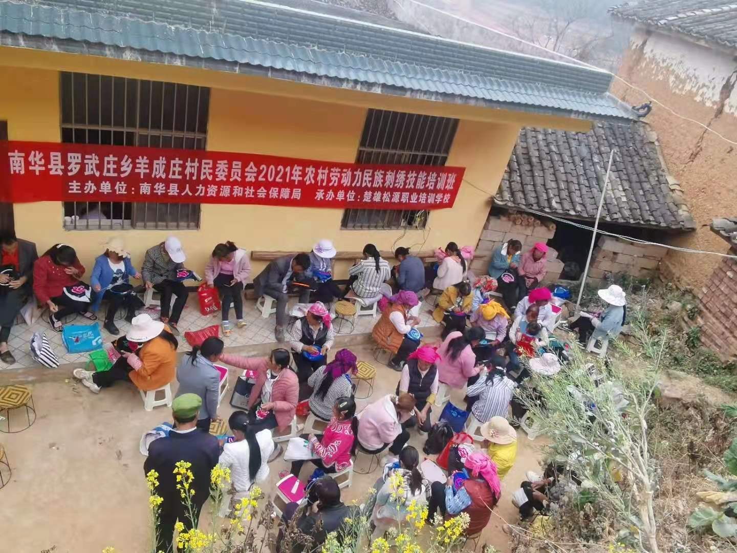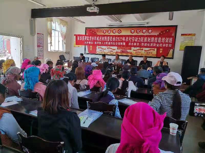 3月19日,由南华县人社局主办,罗武庄乡人民政府和楚雄松源职业培训学校共同承办的南华县2021年首期农村劳动力民族刺绣技能培训班在罗武庄乡羊成庄村委会正式开班,此次培训邀请了拥有多年从业经验的老师来授课,课程为期7天。授课主要采取理论授课、现场示范与实际操作相结合、坚持集中授课与自学交流相结合的方式,围绕“图案设计、色彩搭配、刺绣手法”等方面进行系统的培训。