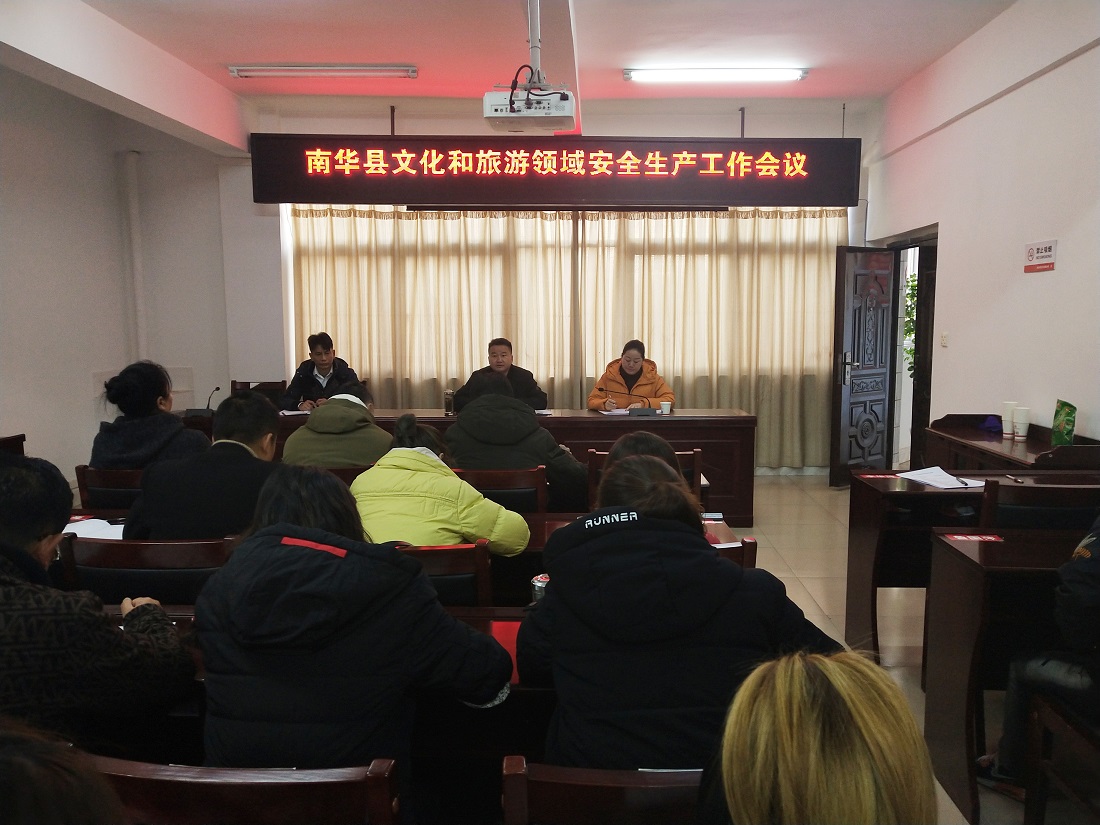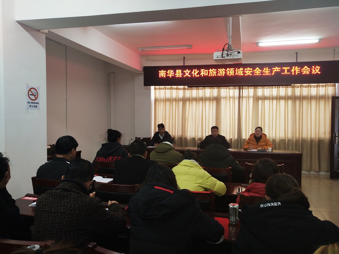 近日,南华县文化和旅游局召开会议,就年末岁初全县文化和旅游领域安全生产工作进行了部署安排。局领导班子成员、局机关各股室(馆站所)全体干部职工,星级宾馆(酒店)、旅行社、特色餐饮名店业主,部分文化企业负责人参加会议。