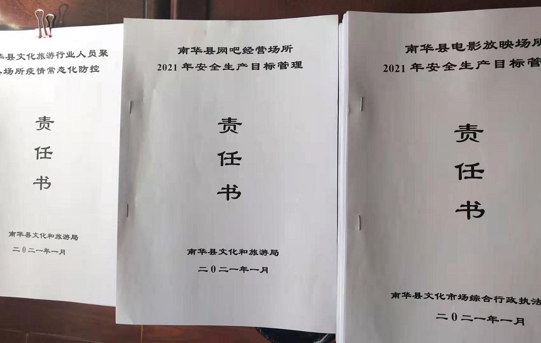 会议还与星级宾馆(酒店)、旅行社、特色餐饮名店业主、部分文化企业、旅游企业负责人签订了2021年安全生产目标管理责任书、互联网上网服务营业场所经营管理安全生产责任书等。(南华县文化和旅游局 李华萍 )