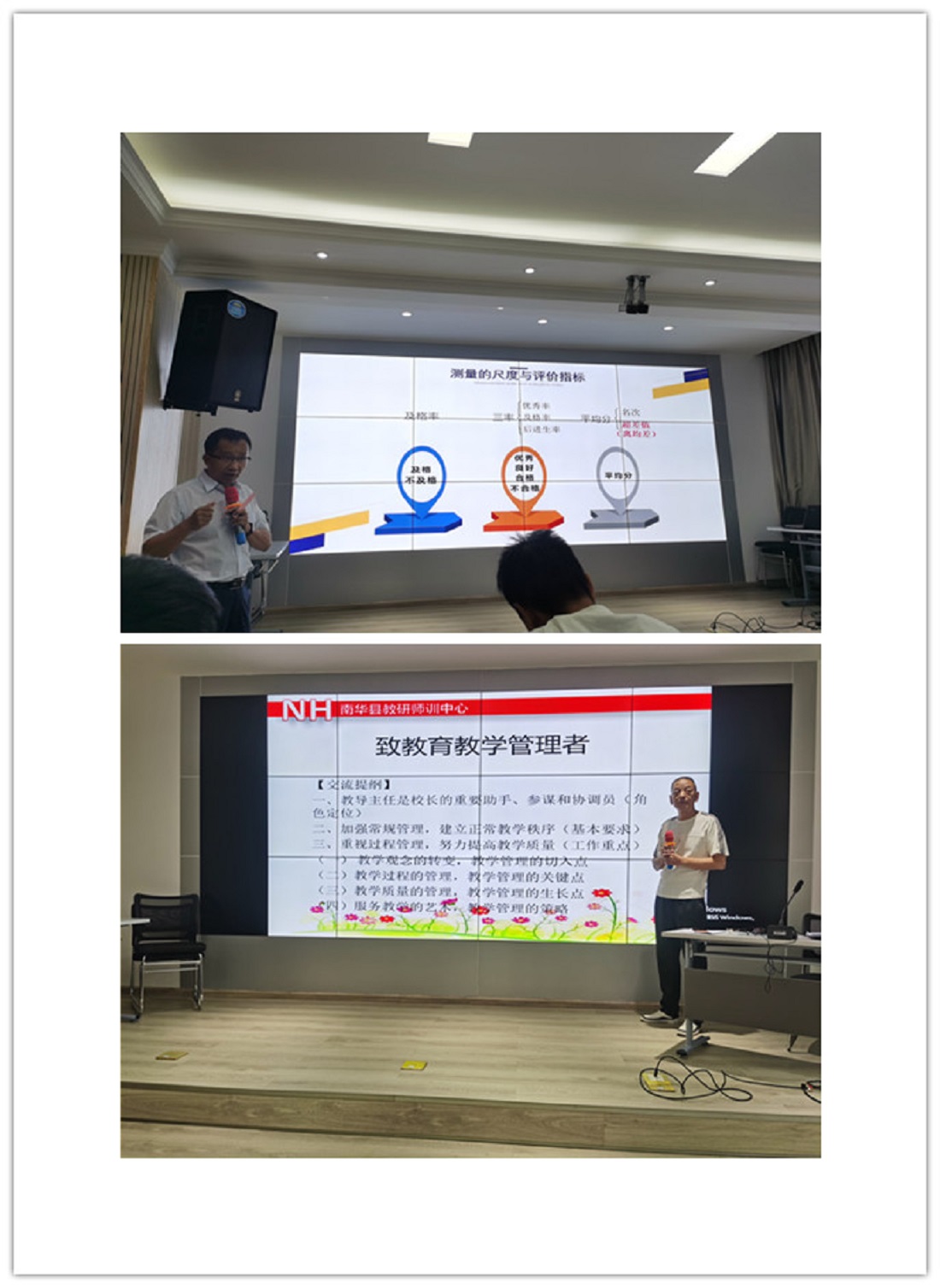 5月6日,县教育体育局教研师训中心主任周晓光作了《教学质量考核评价与< 南华县中小学教师教学工作跟踪问效制度(试行)>解读、教学常规管理与课堂教学有效性的观察指导》专题讲座,张文华老师作了《致敬教学管理者》专题讲座。