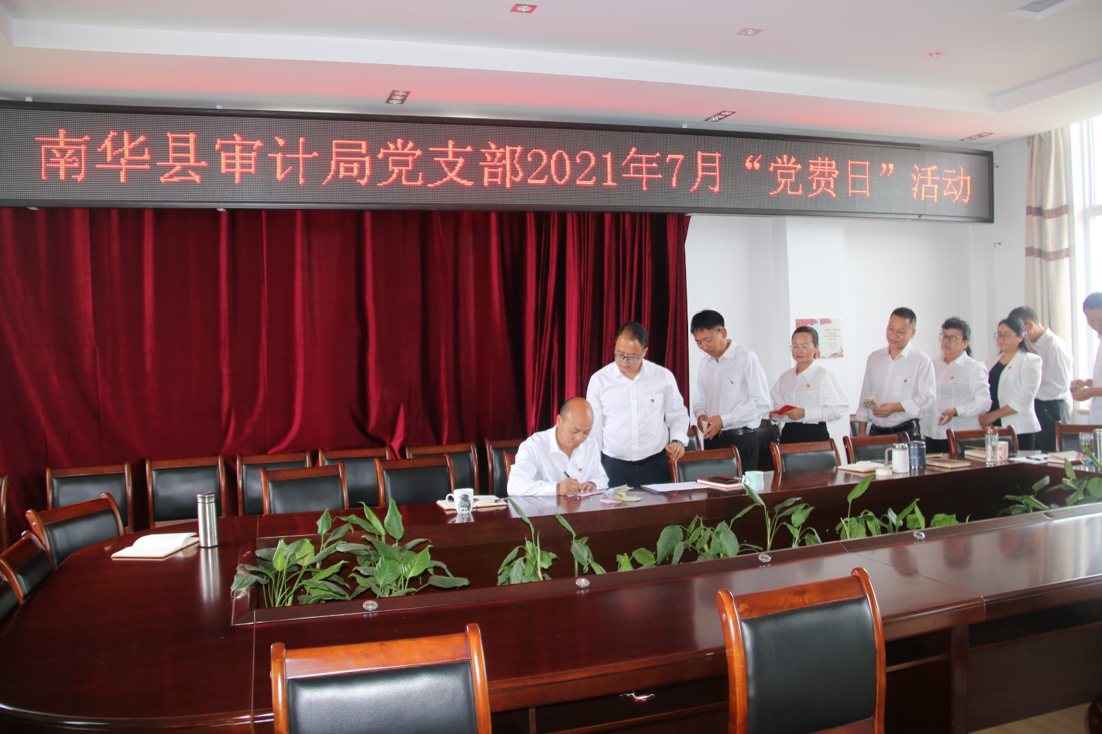庆祝大会结束后,局党支部开展了“党费日”主题活动。局党支部18名党员,手拿现金,排着长队,亲手将自己的党费交给党组织。