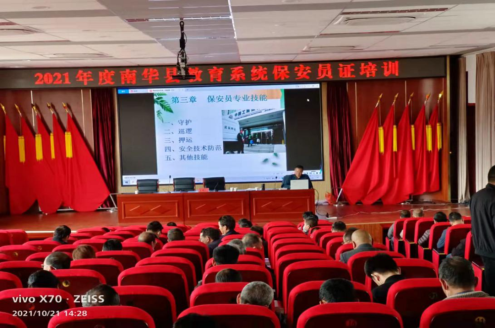 为全面贯彻落实国家、省、州各级关于加强中小学幼儿园人防物防技防建设决策部署和规划目标,确保在收官之年圆满完成校园“三防”建设4个100%(即一是校园专职保安员配备率要达到100%;二是中小学封闭化管理和城市幼儿园封闭化管理达到100%;三是城镇幼儿园以上学校一键式紧急报警、视频监控系统达标率达到100%;四是已安装一键式紧急报警、视频监控系统的中小学幼儿园要实现与属地公安机关、教育体育部门联网,城市“护学岗”设置率达100%)达标任务,切实提升全县中小学、幼儿园安全防范水平,保障广大学生、儿童和教职员工的生命财产安全,维护良好的校园教育教学环境和治安秩序,2021年10月20至22日,南华县教育体育局委托楚雄州保安职业培训学校对南华县教育体育系统90余名保安员进行为期3天的专题培训,培训期间,参培学员积极主动,用心领会学习,培训效果显著,达到了预期的目的。(南华县教育体育局 高应贵)