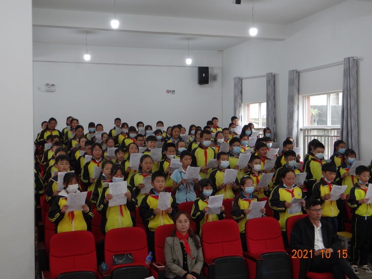 10月15日下午,北城小学的学子们满怀对祖国的崇敬,在学校报告厅举行“请党放心 强国有我”主题建队日活动。出旗时,旗手们迈着整齐的步伐,全体队员敬队礼;紧接着,团县委副书记纪美娇同志作了致辞,为获得红领巾一星章少先队员颁章,全体少先队员朗诵《请党放心,强国有我》献词;随后,少先队员代表分享了红色故事,全体少先队员合唱《中国少年先锋队队歌》;最后,辅导员领呼:“准备着,为共产主义事业奋斗!”全体少先队员“时刻准备着!”的呼号声铿锵有力、响彻云霄。