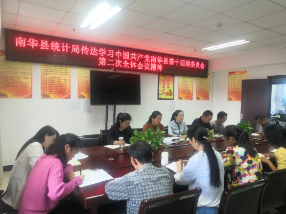近日,南华县统计局召开全体干部职工会议传达学习中国共产党南华县第十四届委员会第二次全体会议精神。会议由局党组书记、局长蔡华香主持,局班子成员、全体干部职工参加了学习。