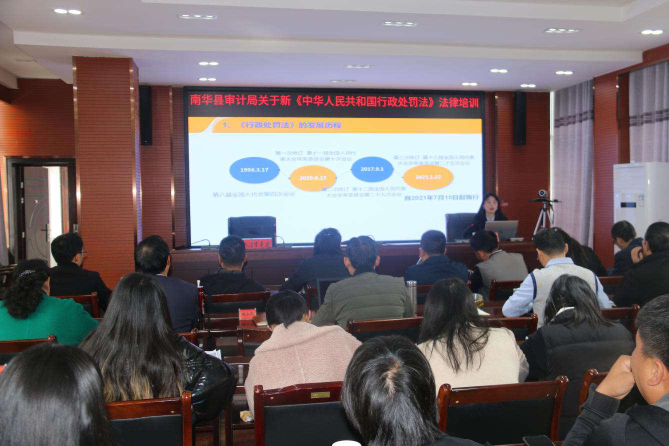 近日,为深入学习新修订的《中华人民共和国行政处罚法》,强化行政执法人员对新法的理解和适用,提升审计机关审计执法水平,加快推进新时代法治政府建设,南华县审计局邀请云南兴彝律师事务所律师李洁作专题培训,审计局全体干部职工参加了培训。