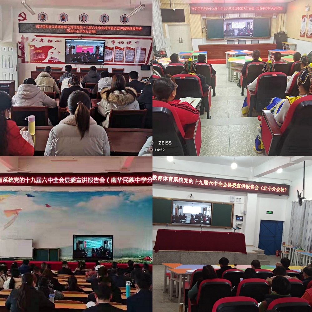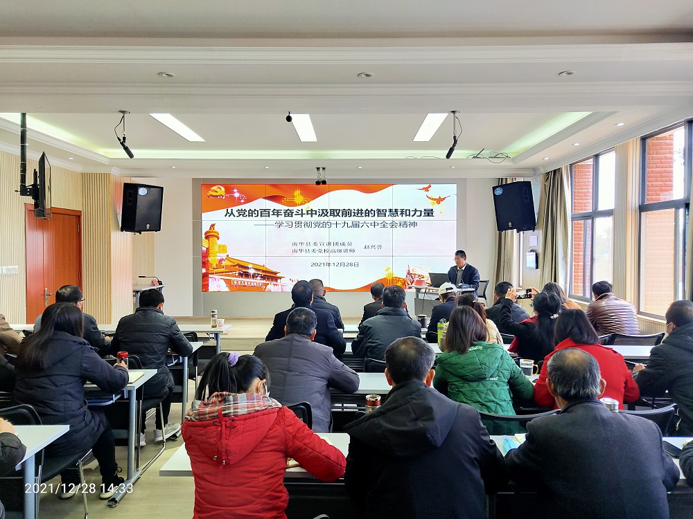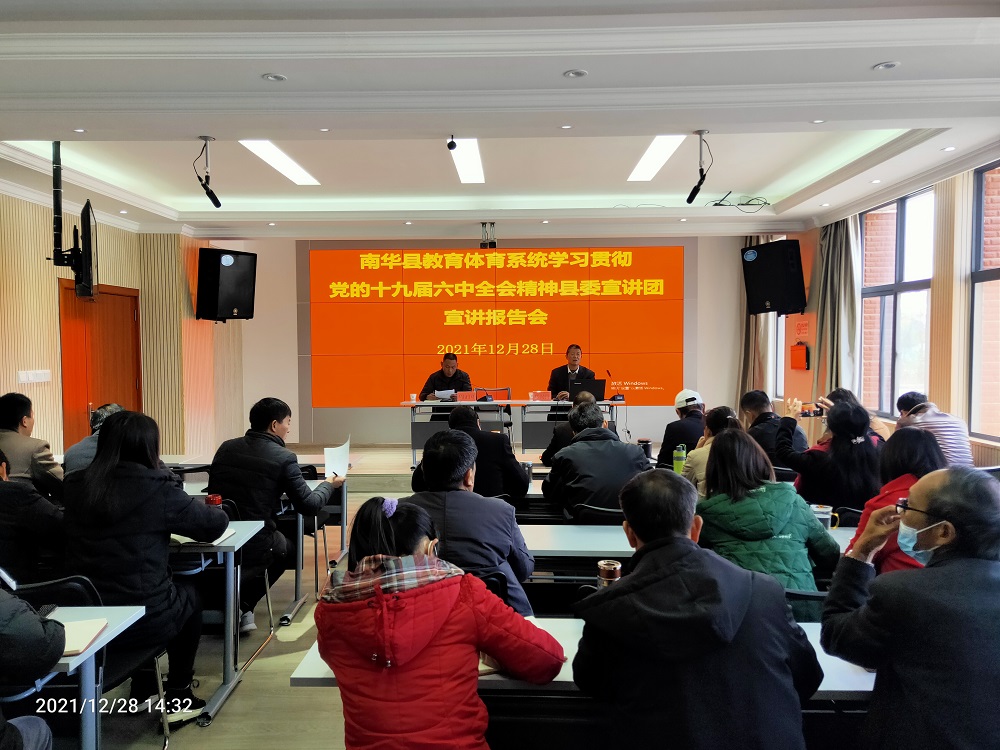为深入学习贯彻党的十九届六中全会精神,引导广大党员干部群众把思想统一到全会精神上来,把力量凝聚到落实全会作出的各项重大部署上来,推动兴起学习贯彻全会精神的热潮,根据县委关于党的十九届六中全会精神宣讲工作的安排,2021年12月28日下午,南华县教育工委组织召开教育体育系统党的十九届六中全会县委宣讲报告会。