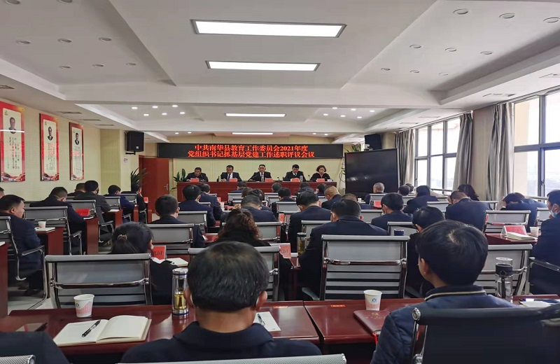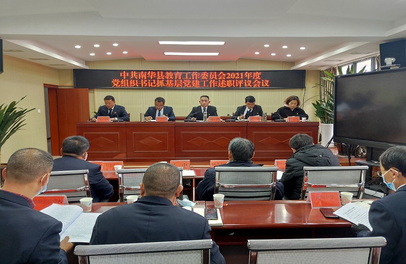 2022年1月24日,南华县教育工委召开2021年度党组织书记抓基层党建工作述职评议考核会,县教育工委、县教育体育局党政班子成员,局机关各股室负责人,各党总支(支部)书记、校(园)长,县党代表,县人大代表,党员教师代表,离退休老党员代表共计60余人参加会议,会议由县教育工委书记、县教育体育局党组书记周正国同志主持。