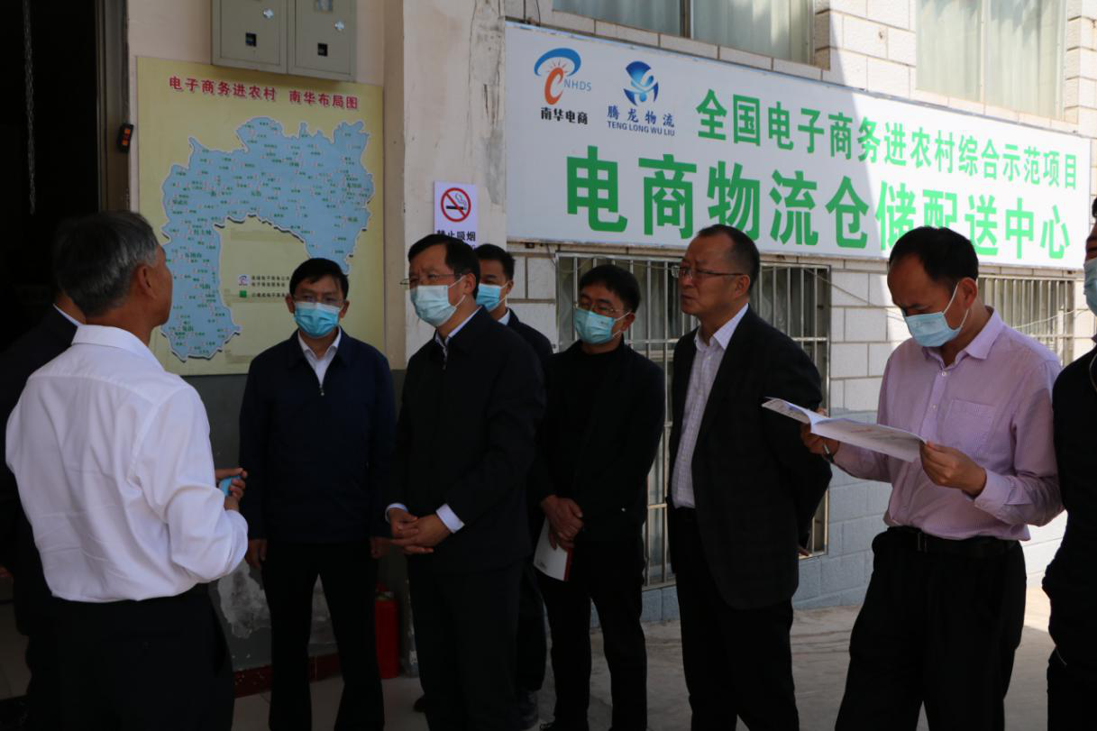 4月22日,云南省商务厅党组书记、厅长李晨阳,带领省商务厅市场建设处、物流产业处、电子商务处、商贸处、办公室等处室领导赴南华县开展稳增长综合调研。调研组在州人民政府副州长程鹏、州商务局局长唐思虎陪同下,先后深入南华县腾龙物流有限公司、南华县电子商务物流配送中心、南华县咪依噜天然食品开发有限公司调研指导工作,通过听取企业负责人汇报和实地查看的形式详细了解安全生产、县域商业体系建设、物流产业和电子商务发展情况,认真听取企业意见,现场回应企业诉求。