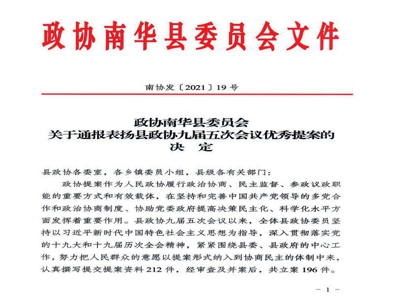 日前,政协南华县委员会印发《关于通报表扬县政协九届五次会议优秀提案的决定》,对2021年政协委员提案办理工作进行通报表扬,南华县消防救援大队被县政协授予“2021年度提案承办先进单位”称号。