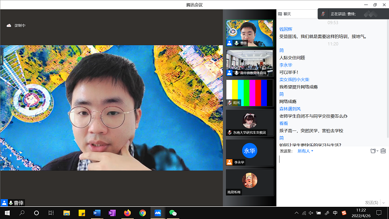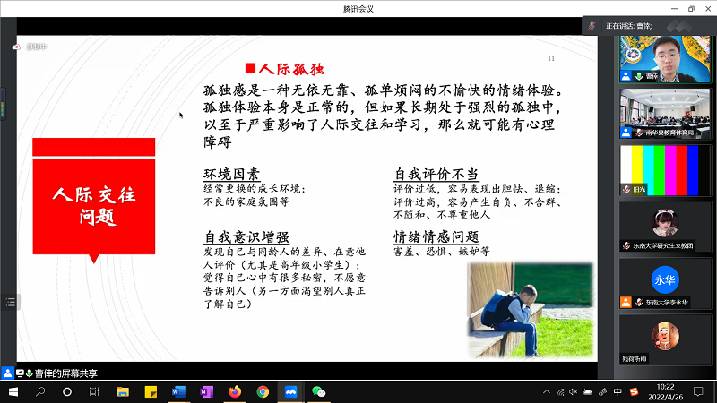 首场培训,东南大学曹倖老师作《中小学生心理发展的一般特点与典型问题》讲座,围绕中小学生不同年龄阶段的情绪情感、人格、社会性等发展特点及可能出现的问题展开,旨在引发大家对教育教学过程中心理问题的相关思考。