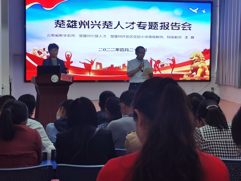 2022年4月27日,州委组织部组织的楚雄州兴楚人才专题报告会在南华县龙川小学举行。龙川小学、东城小学、北城小学及教研师训中心共计70余人参加了报告会。报告会由南华县教育体育局教研师训中心主任周晓光主持,云南省教学名师、楚雄州兴楚人才、楚雄开发区实验小学高级教师、特级教师王静作了《执着无私为教育,只为桃李满园香》的报告。