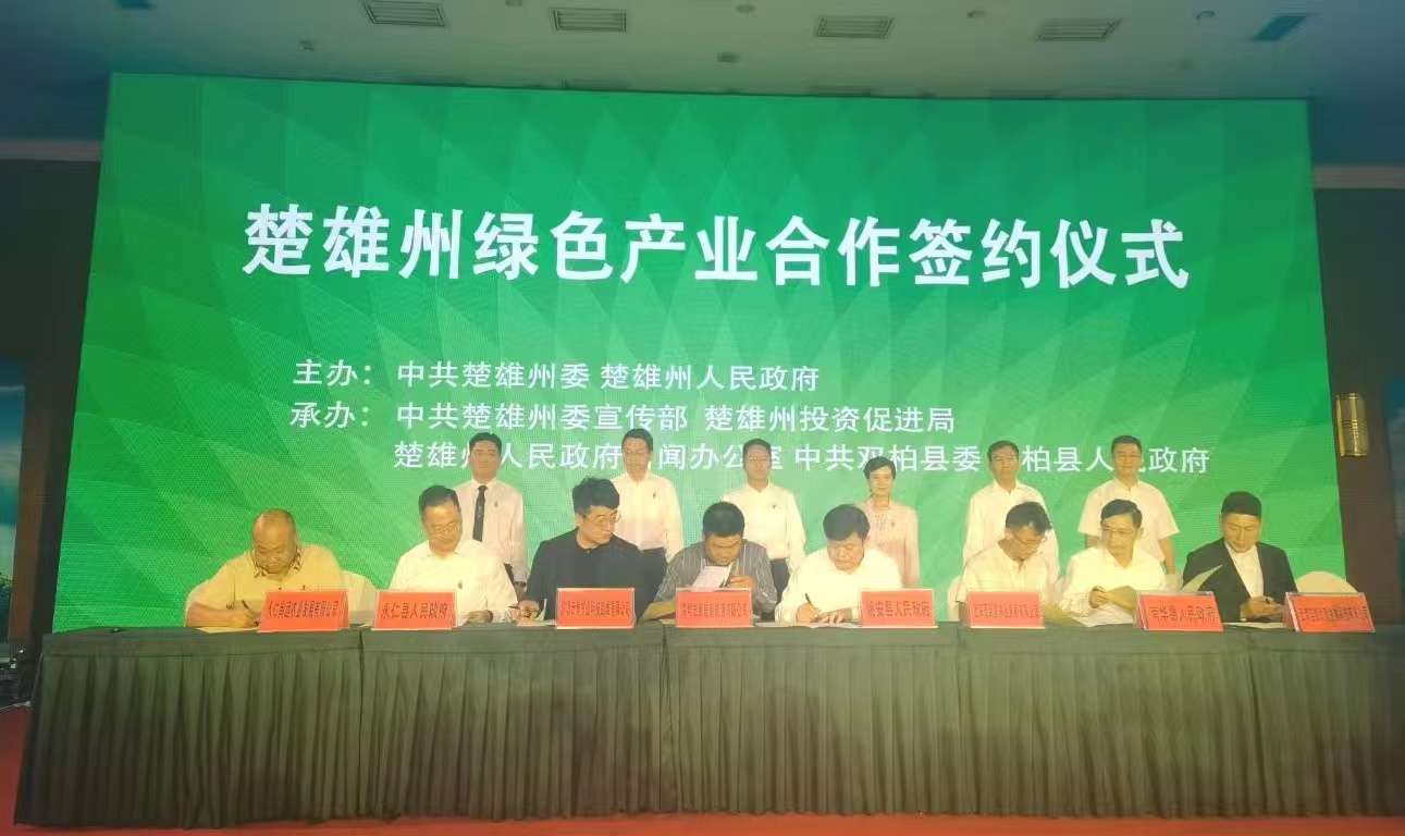 6月18日,在楚雄州绿色产业推介会上,县长陈如军以”奢雅菌香世界共享”为主题向大家推介了南华县食用菌、绿色食品、绿色制造、绿色能源、文化旅游五大绿色产业,并与上海爱到家农业发展有限公司、云南自然之道生物科技有限公司签约南华县礼社江低热河谷特色果蔬种植示范园、南华县食用菌种植加工全产业链示范项目,协议投资额共8.5亿元。