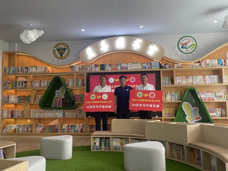 在东南大学援建的至善图书室,邢副书记一行观看了刚刚建好的温馨而富有书香氛围的阅读场所,看到精神饱满的一群少先队员在这样的环境里读书而感到欣慰!在县教育体育局周局长的主持下,东南大学邢副书记还为龙川小学和龙川中学举行了捐赠平板电脑仪式。仪式上,东南大学为龙川小学和龙川中学分别捐赠了55台和44台华为平板电脑,邢副书记鼓励龙川小学为下步开启智慧课堂编程教育作出进一步的尝试。
