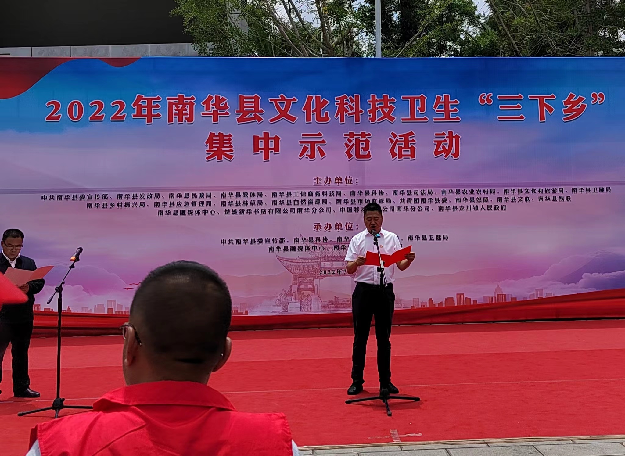 2022年7月3日下午,龙泉广场人头攒动,一片热闹景象。由县委宣传部、县文化和旅游局、县林草局等多家单位联合举办的2022年南华县文化科技卫生“三下乡”集中示范活动在此举行。