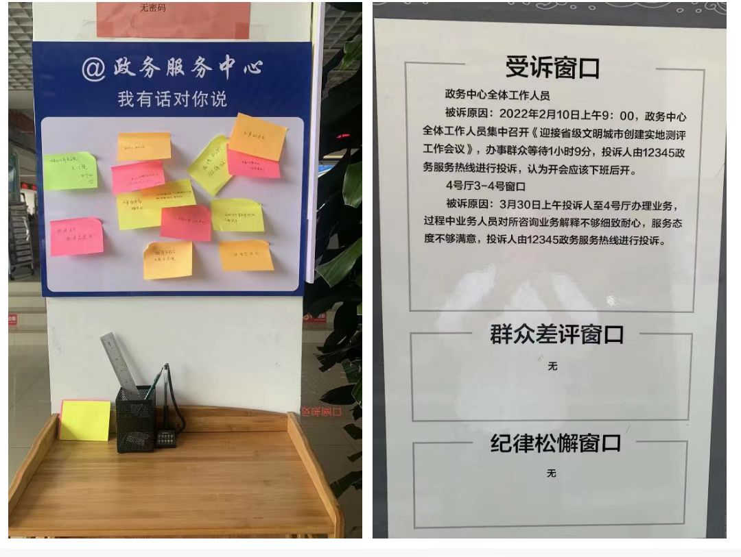 听意见、促提升。除了政务服务系统“好差评”和大厅投诉窗口外,南华县政务服务大厅还设立了“办不成事”反映窗口和“找茬”窗口,为办不了事或是办事不顺群众提供了一个解决问题的平台,尽量让群众少跑腿、一次办。在大厅入口设立“@政务服务中心我有话对你说”留言板,群众可以随心随手对我们大厅工作提出工作批评或是意见建议,便于工作人员随时对大厅管理进行整改提升,同时也对窗口工作状态进行广泛监督。从4月设置至今,共收集表扬意见121条,批评意见8条,有效建议15条。