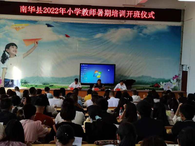 2022年7月26日上午8点,南华县2022年中小学幼儿园教师全员培训在南华民族中学报告厅举行开班仪式,来自全县各学校的第一期培训学员、县教育体育局领导、教研员共计200余人参加仪式,拉开了南华县2022年小学教师全员培训的序幕。