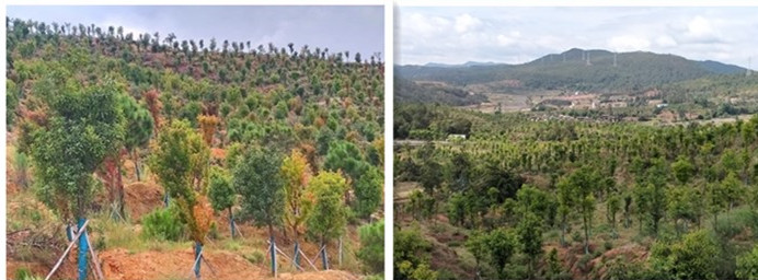 南华县认真贯彻落实省州高速公路路域环境绿化美化工作部署,本着因地制宜、适地适树的原则,在保留原有森林资源的基础上,实施林地绿化或景观改造。工作中严把规划设计、苗木质量、施工管理、抚育管护等关键环节,全面完成昆丽高速公路南华段路域环境绿化美化项目建设,在公路产权范围外两侧100m范围路域完成绿色廊道工程建设3811.1亩,实施造林小班225个,种植米径8cm以上云南樟、球花石楠、滇朴、栾树、三角枫、蓝花楹、垂柳等绿化苗木17万多株,目前苗木长势良好,打造了一条四季常绿、特点鲜明的绿色景观廊道,充分展示了生态文明建设成果。