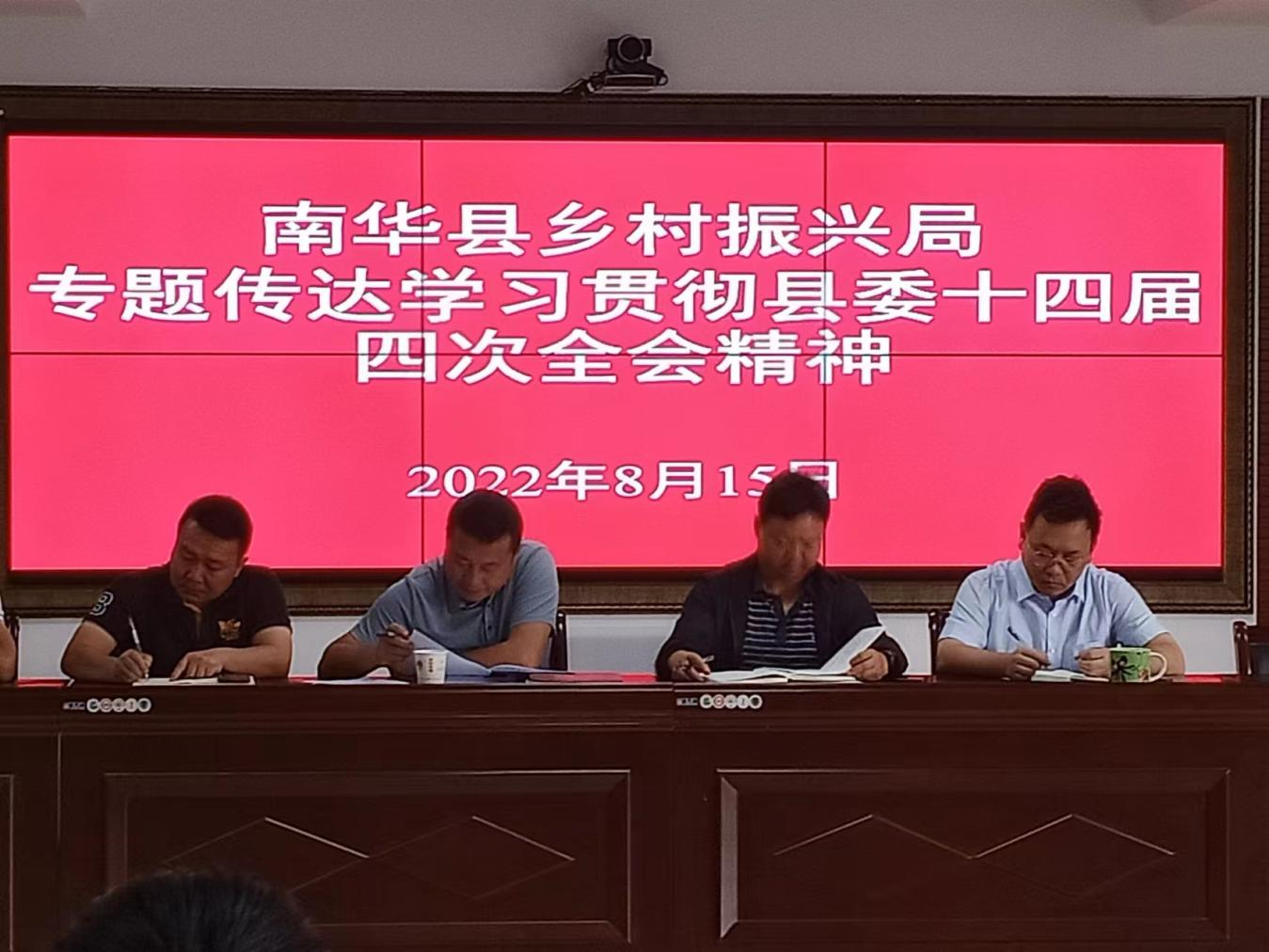 8月15日上午,县乡村振兴局召开专题会议,传达学习中国共产党南华县第十四届委员会第四次全体会议精神。会议原文传达学习了《中国共产党南华县第十四届委员会第四次全体会议公报》,认真传达学习了县委马特书记在全会上的讲话精神。县乡村振兴局党组书记、局长祝应兴主持会议并讲话,全体干部职工参加会议。